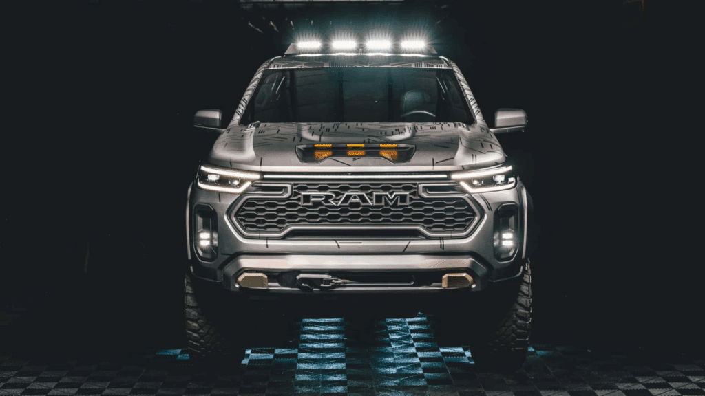 Stylistically, it fits right into Ram’s current lineup with a trapezoidal grille stamped “RAM,” a slim LED bar linking the headlights, and a hood intake with triple amber LEDs inspired by the 1500 RHO and TRX.